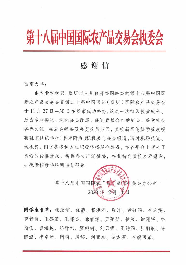 近日,第十八届中国农交会执委会特向学校发来感谢信,认为这是一次成功的校地合作,并祝学校教学科研再上新台阶。