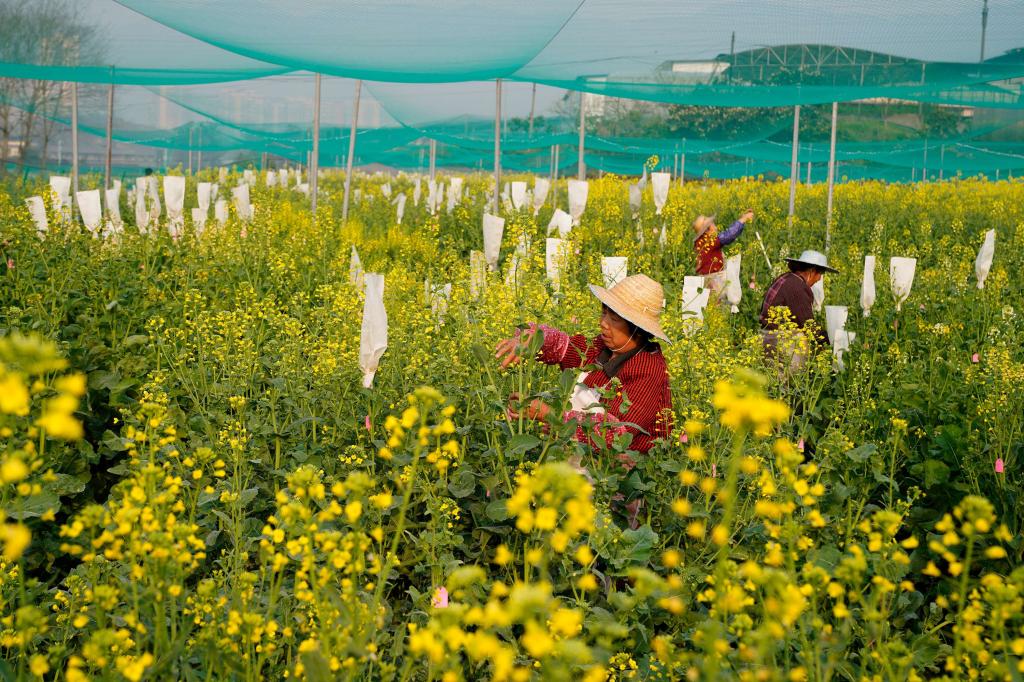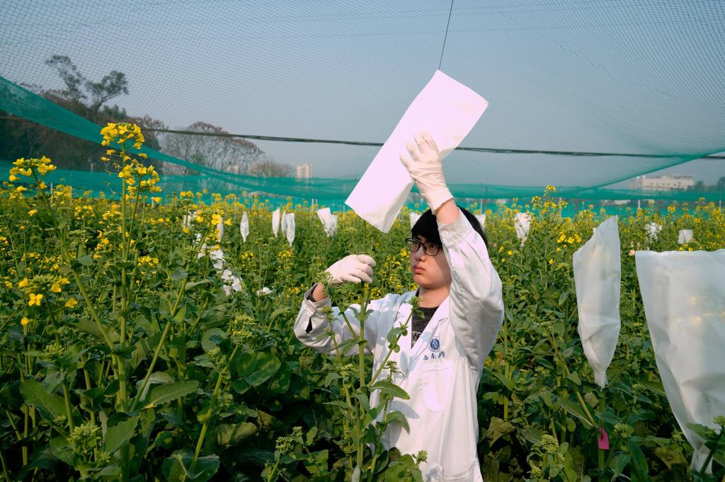 ↑2月22日,在重庆市油菜工程技术研究中心,437ccm必赢国际官方网站农学与生物科技学院的学生在给油菜花套袋。