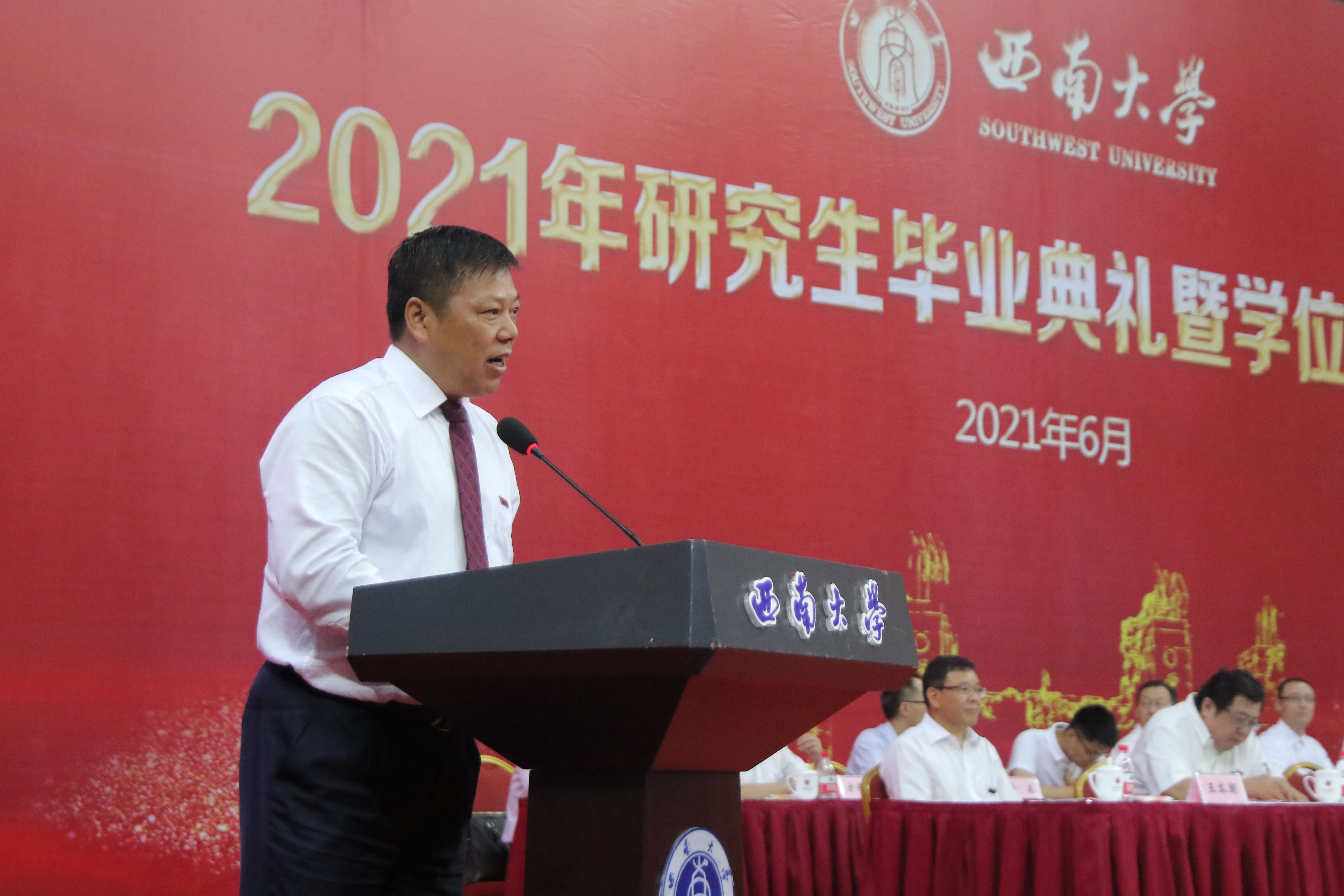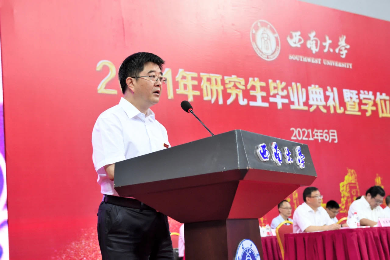 毕业研究生代表、外国语学院2018级博士研究生司卫国同学回顾分享自己研究生期间浸润汗水的苦读时光和累累硕果,呼吁全体毕业研究生从“特立西南”的坚守,收获“学行天下”的未来;研究生指导教师代表、国家级人才称号获得者、学校农学与生物科技学院教授、博士生导师何光华希望同学们开启自己的“袁梦计划”,把热爱汇入星辰大海,把个人融入时代洪流,像已故校友袁隆平院士一样“正青春”地奔跑追梦;校友代表、心理学部2009届毕业博士生、国家级青年人才称号获得者、辽宁师范大学教授、博士生导师罗文波希望师弟师妹们永远保持良好的学习习惯,加强身体锻炼、注重身心健康,在经风雨、见世面中长才干、壮筋骨。