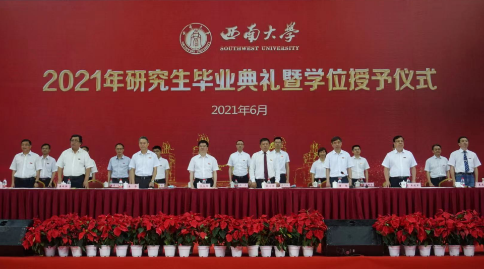 全体在校校领导、党委常委,校学位评定委员会委员,校学生工作领导小组成员单位主要负责人,校友代表,各研究生培养单位负责人、导师代表、辅导员、教学秘书,2021届全体毕业研究生以及专程返校的部分2020届毕业研究生在现场见证了这一难忘时刻。毕业研究生、家长、校友及关心学校发展的网友有近20万人次通过在线直播“云上观礼”。毕业典礼环节由学校党委副书记潘洵主持,授位仪式环节由学校副校长王进军主持。