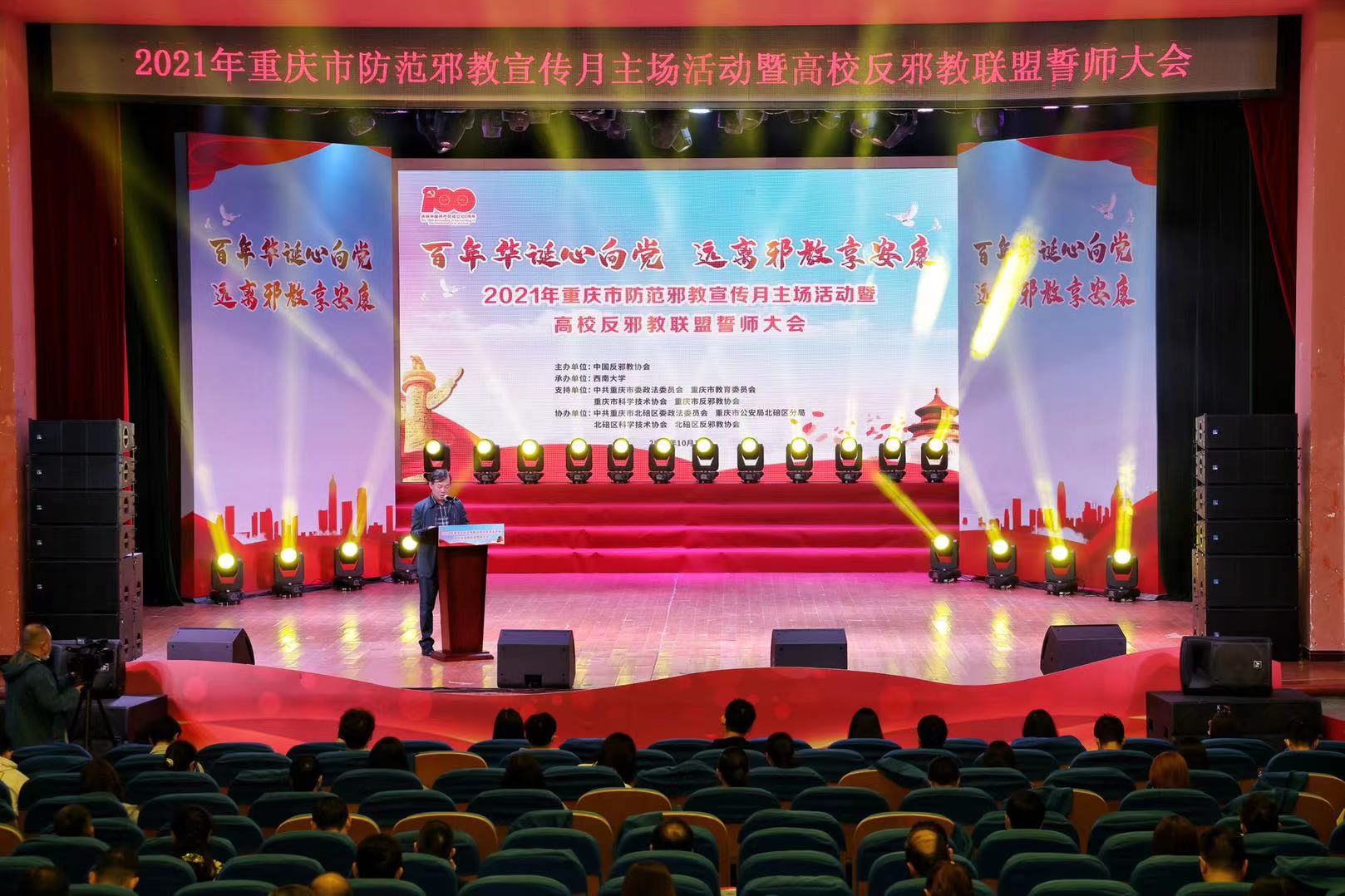 10月12日上午,以“百年华诞心向党 远离邪教享安康”为主题的2021年重庆市防范邪教宣传月主场活动暨高校反邪教联盟誓师大会在学校光大礼堂举行。市科协党组成员、副主席陈昌明,市委教育工委委员、市教委副主任邓沁泉,市民族宗教委党组成员、副主任周先常,北碚区委常委、政法委书记苟鹏,学校副校长崔延强,党委常委、党委宣传部部长、党委网络工作部部长李荣华,校科协、保卫处负责人出席活动。启动仪式由市科协党组成员、二级巡视员,市反邪教协会常务副会长牛杰主持。
