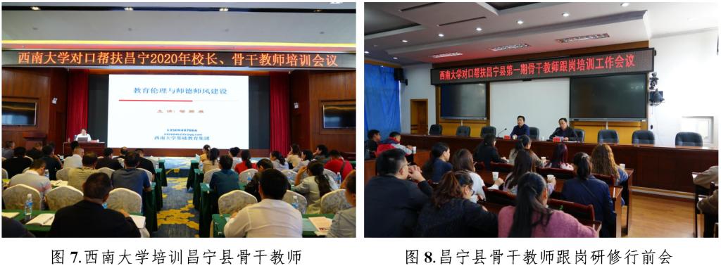 学校坚持把提升昌宁县教师的整体素质和水平作为重点,依托教师教育学院、基础教育投资集团、附属中学等单位通过送教上门、跟岗研修开展多形式多层次的教师培训,全方位提升昌宁中小学教师管理能力和教学能力,增强当地教育系统的“造血”功能,促进昌宁县基础教育阶段教师快速成长,培养一批观念新、能力强、素质高的新型教师队伍。截至目前,已开展线上线下培训班7期,共培训昌宁县基础教育(骨干)教师和中小学校(园)长760余人次,接收昌宁中小学、幼儿园骨干教师166人到学校附属中学、附属小学、实验幼儿园和合作办学学校进行跟岗学习。2021年9月,附属中学接收昌宁县5名优秀高中骨干教师到附属中学开展为期一年的跟岗教学研修,采用分学科分学段“师带徒”方式,并承担一门课程完整教学工作,在教育教学中领悟和践行附属中学的教育理念和教学方法。