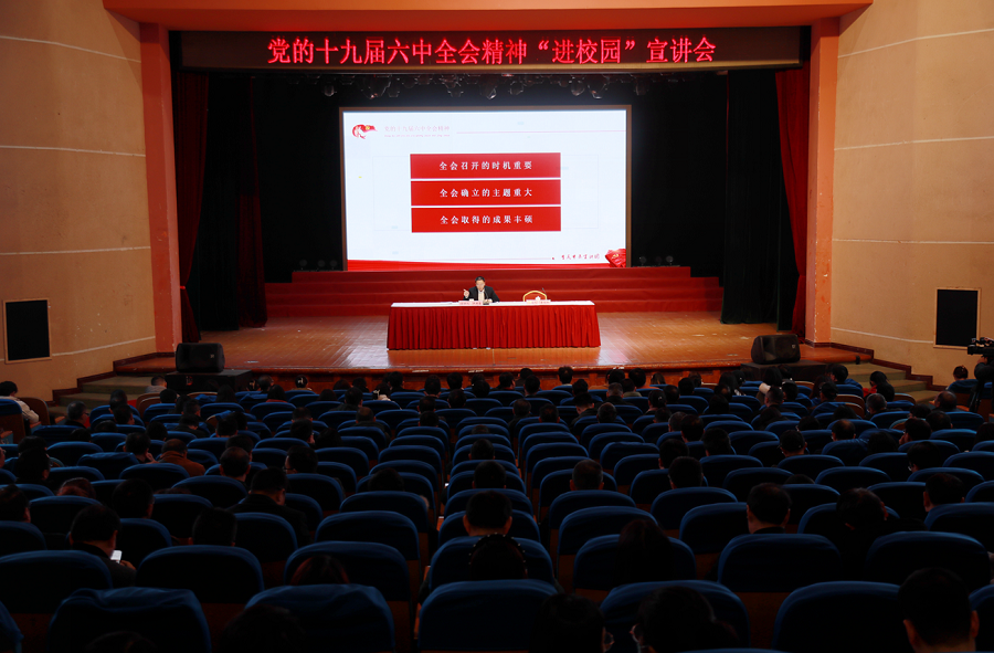 为深入学习领会党的十九届六中全会精神,按照重庆市委有关通知要求,12月9日,学校在光大礼堂召开党的十九届六中全会精神进校园宣讲报告会,听取重庆市委宣讲团成员、市委组织部常务副部长尹国喜同志作党的十九届六中全会精神宣讲报告。全体在校校领导、正处级领导干部,机关党委全体教职工,全体专职组织员、专职辅导员和学生代表参会,学校党委书记李旭锋主持会议。