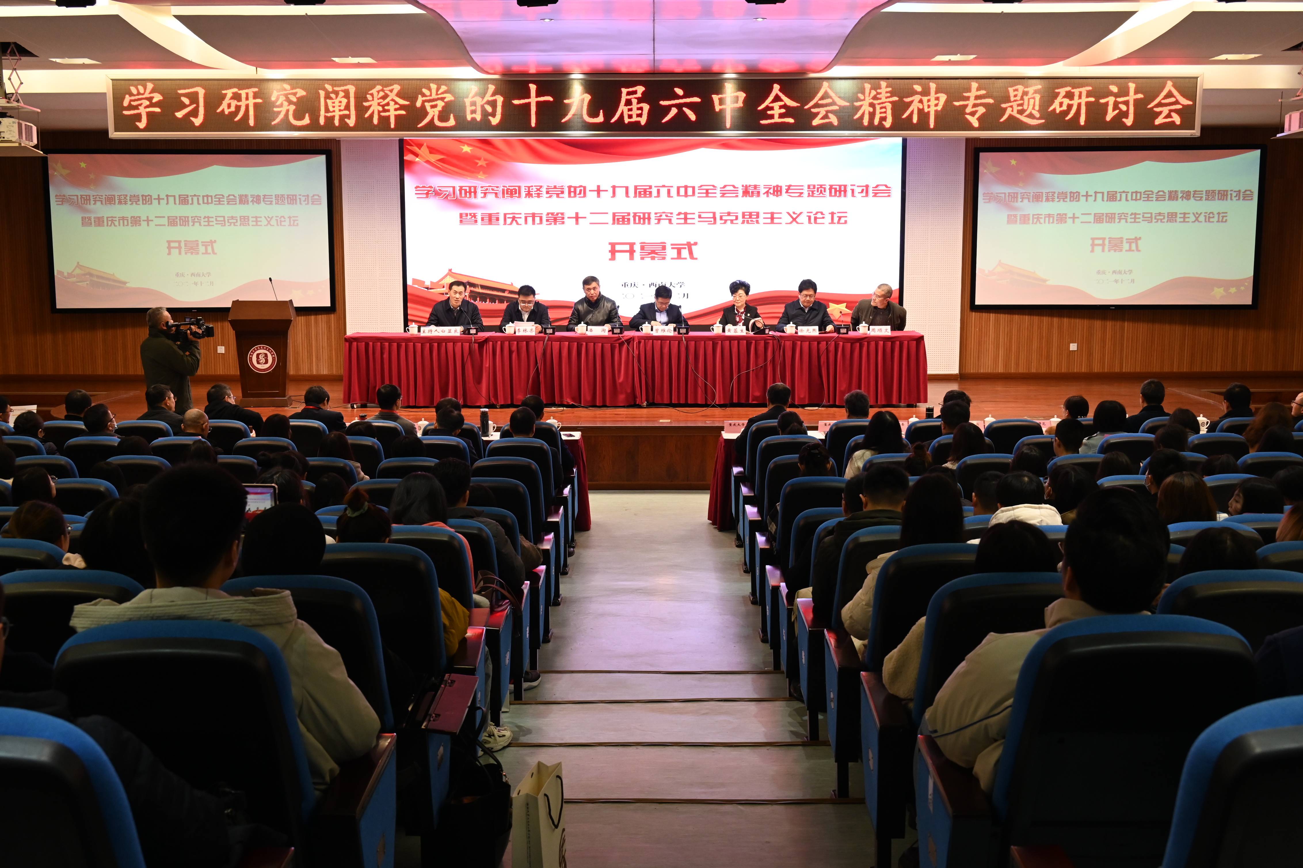 12月11日,学习研究阐释党的十九届六中全会精神专题研讨会暨重庆市第十二届研究生马克思主义论坛在学校马克思主义学院举行。中共重庆市委宣传部副部长曾维伦、中共重庆市委党史研究室副主任徐光煦、中共重庆市委教育工委宣教处处长李林齐、重庆市社科联规划评奖办调研员周顺文、437ccm必赢国际官方网站党委副书记潘洵、教育部高校思政课教指委咨询委员黄蓉生等出席开幕式。来自437ccm必赢国际官方网站、重庆大学等10余所高校马克思主义学院的领导、老师和研究生代表200余人参加会议,会议由学校马克思主义学院院长白显良主持。