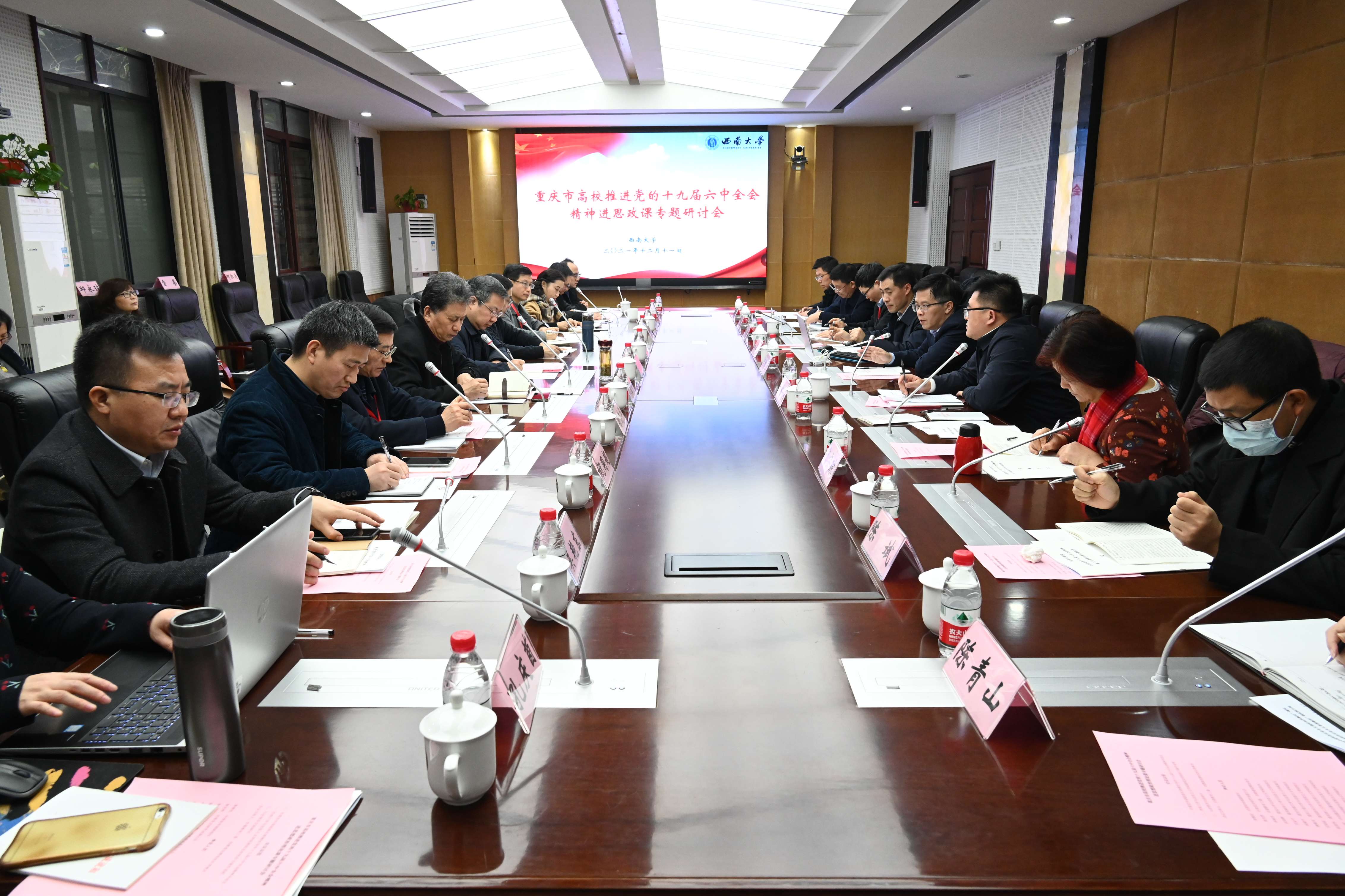 12月11日上午,重庆市高校推进党的十九届六中全会精神进思想政治理论课专题研讨会在学校马克思主义学院举行。市委宣传部副部长曾维伦,市委教育工委、市教委宣教处处长李林齐出席研讨会。重庆大学、437ccm必赢国际官方网站、重庆市委党校、西南政法大学、四川外国语大学、重庆师范大学、重庆邮电大学、重庆交通大学、重庆工商大学、重庆医科大学、重庆理工大学、四川美术学院、重庆科技学院、长江师范学院、重庆三峡学院、重庆第二师范学院、重庆城市管理职业学院17所高校马克思主义学院主要领导参加此次研讨,研讨会由李林齐主持。