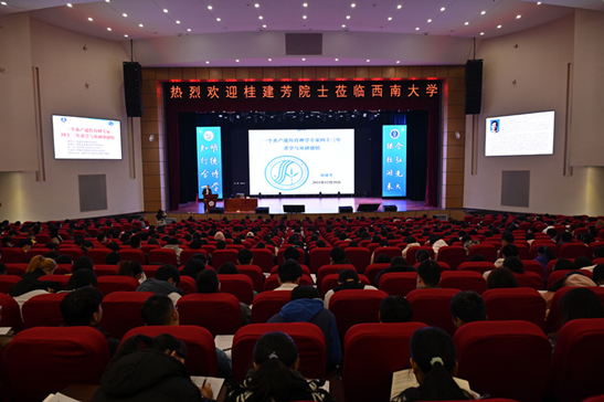 报告会在荣昌、北碚设有两个会场,全场座无虚席。桂建芳院士以《一个水产遗传育种学专家四十三年求学与从研感悟》为题,从笨鸟先飞、乐观进取是成长的关键,持之以恒、执着拓新是科研成就的必经路径,珍惜机遇、豁达奉献是快乐幸福的源泉等三个方面,同在场师生分享了自身求学和探索之路及收获感悟。