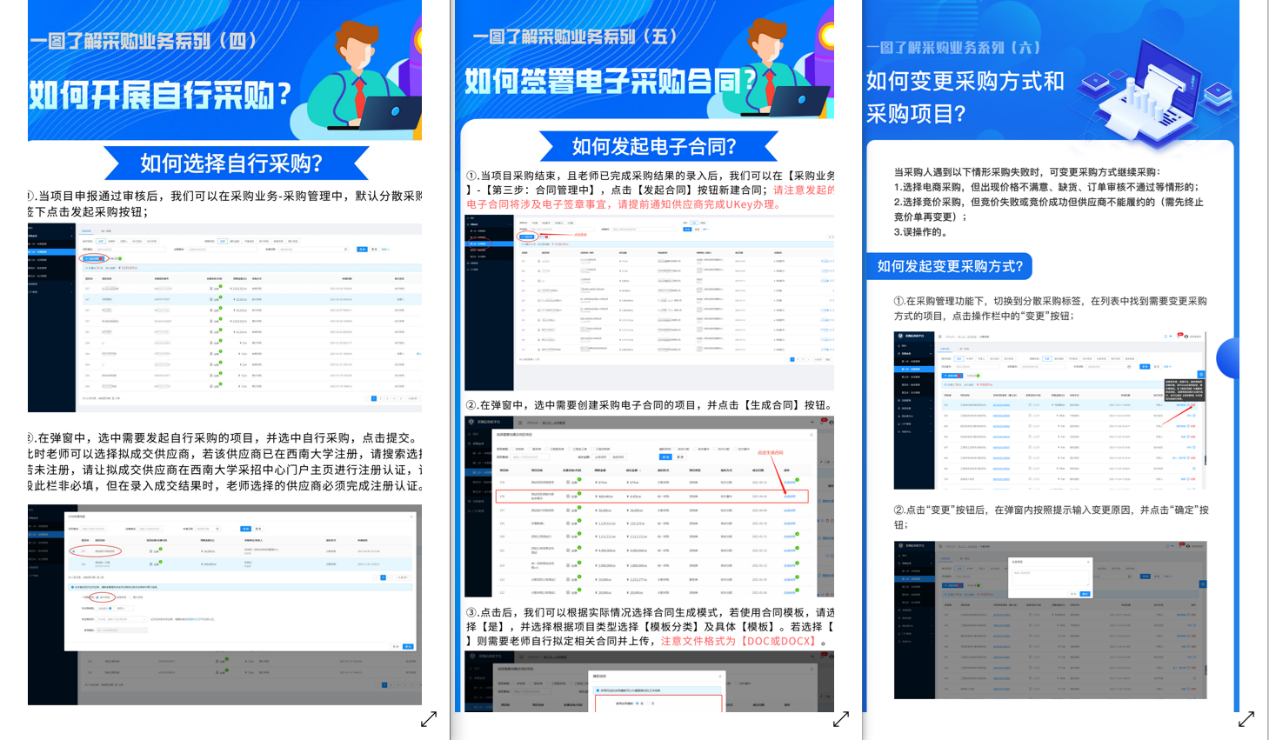 在国家“双一流”建设和深化政府采购制度改革的双重背景下, 2019年,437ccm必赢国际官方网站提出了建设“采购业务一站式”的构想,并通过建设采购信息化平台,利用信息化手段,实现“让数据多跑路、让老师少跑腿”。为使老师能够顺畅地办理采购各项业务,中心重新梳理了采购业务流程,将采购各个阶段进行分解,制作了6期图文版《一图了解采购业务》,用系列图文的方式把对应的办事要点以直观的方式呈现出来。该图文系列指引简明扼要、图示清晰,老师们纷纷点赞。