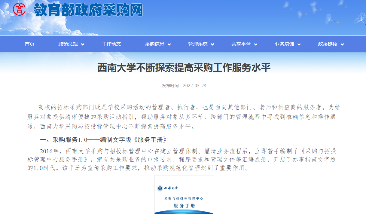 3月23日,教育部政府采购网“工作动态”栏目头条,报道学校不断探索提高采购工作服务水平的各项举措。