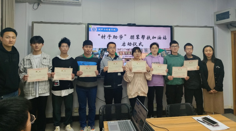 3月25日下午,材料与能源学院在22教102会议室举行“材子助学”朋辈帮扶加油站启动仪式。学院为首批助学团成员颁发聘书,宣布助学团成立的意义、发挥的作用、主要工作流程。