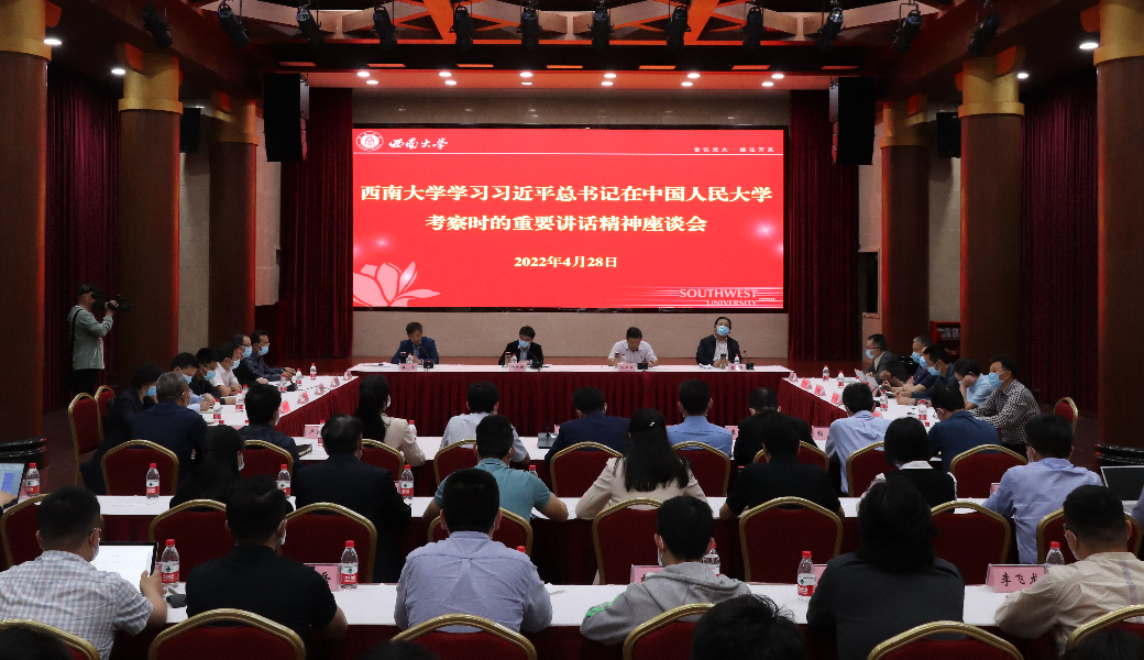 4月28日下午,学校在东方红会议厅召开学习习近平总书记在中国人民大学考察时的重要讲话精神座谈会,深入学习习近平总书记重要讲话精神,交流心得体会。党委书记李旭锋、校长张卫国、党委副书记潘洵、副校长崔延强出席座谈会。潘洵主持会议。