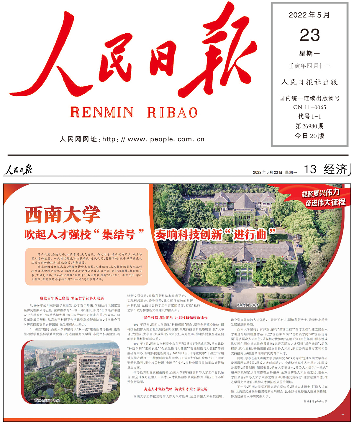 5月23日,《人民日报》第13版以《437ccm必赢国际官方网站 吹起人才强校“集结号” 奏响科技创新“进行曲”》为题,报道学校坚持学术立校、人才强校的担当作为,为学校立足西部,强化教师教育与农业科技两大办学特色和优势,大力推动高质量内涵式发展,为国家和地方经济社会发展贡献重要力量的高校答卷点赞,更是对学校秉承“含弘光大,继往开来”校训接续迈进新时代的认可和鼓舞。