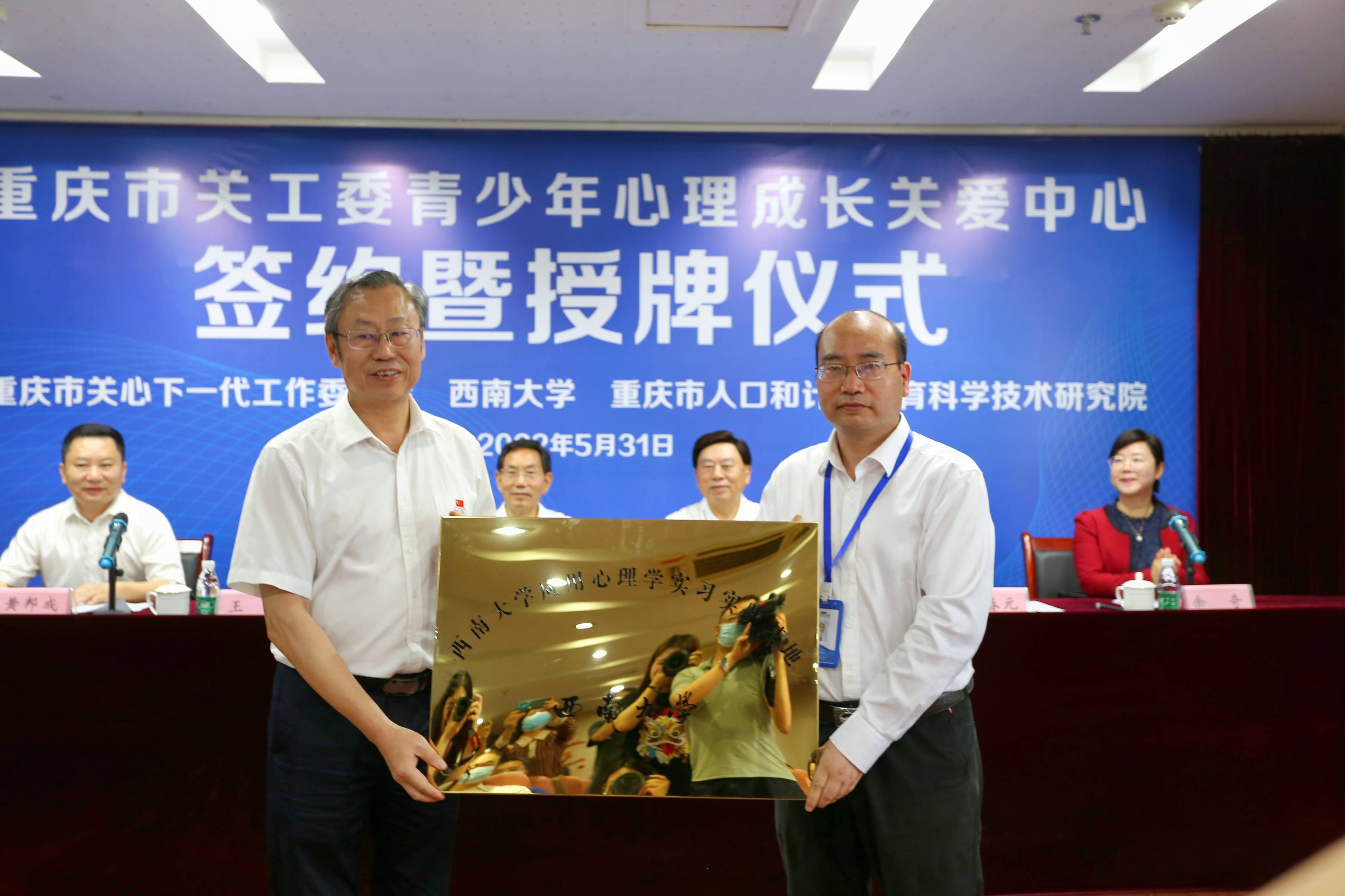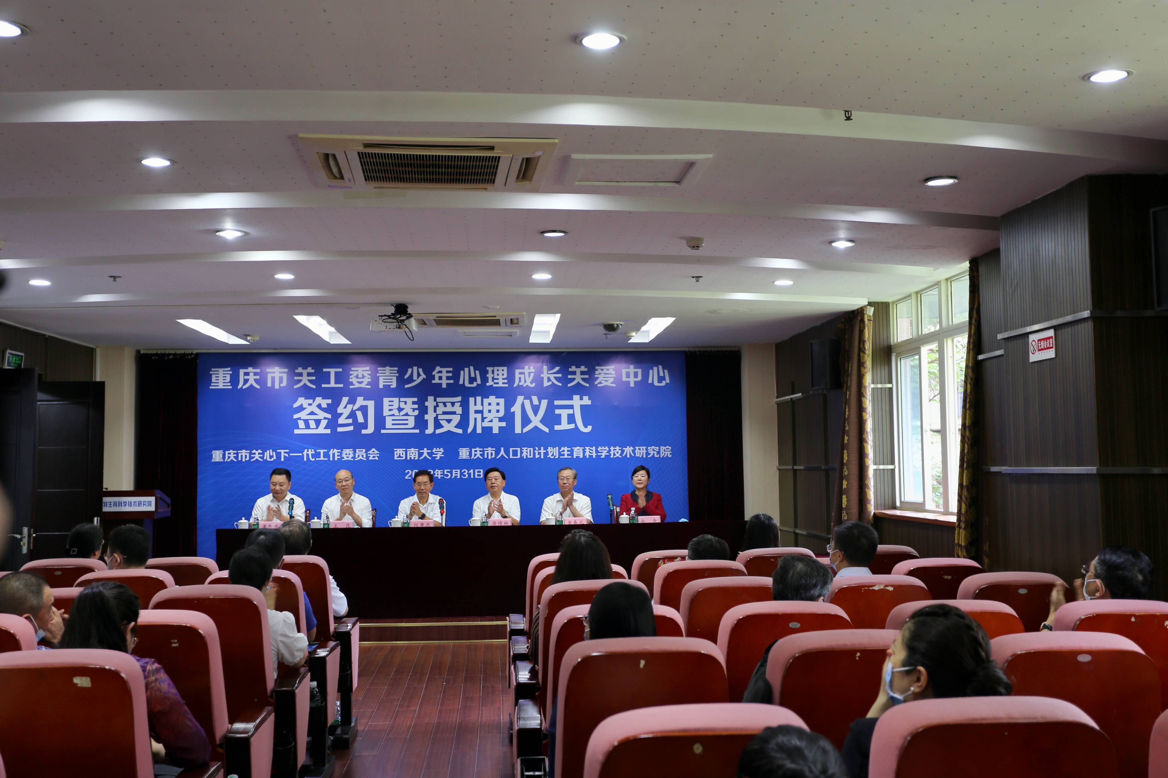 5月31日,在“六一”国际儿童节来临之际,心理学部与重庆市关工委、重庆市人口计生研究院举行“重庆市关工委青少年心理成长关爱中心” “437ccm必赢国际官方网站应用心理学专业实习实践基地”签约暨授牌仪式。市关工委主任何事忠、常务副主任唐情林、副主任刘丽俐、秘书长韩国涛,市卫生健康委副主任王昆,市人口计生研究院党委书记黄邦成、院长余奇,学校党委副书记安春元出席仪式,学校国内合作处、心理学部有关领导教师参加仪式。