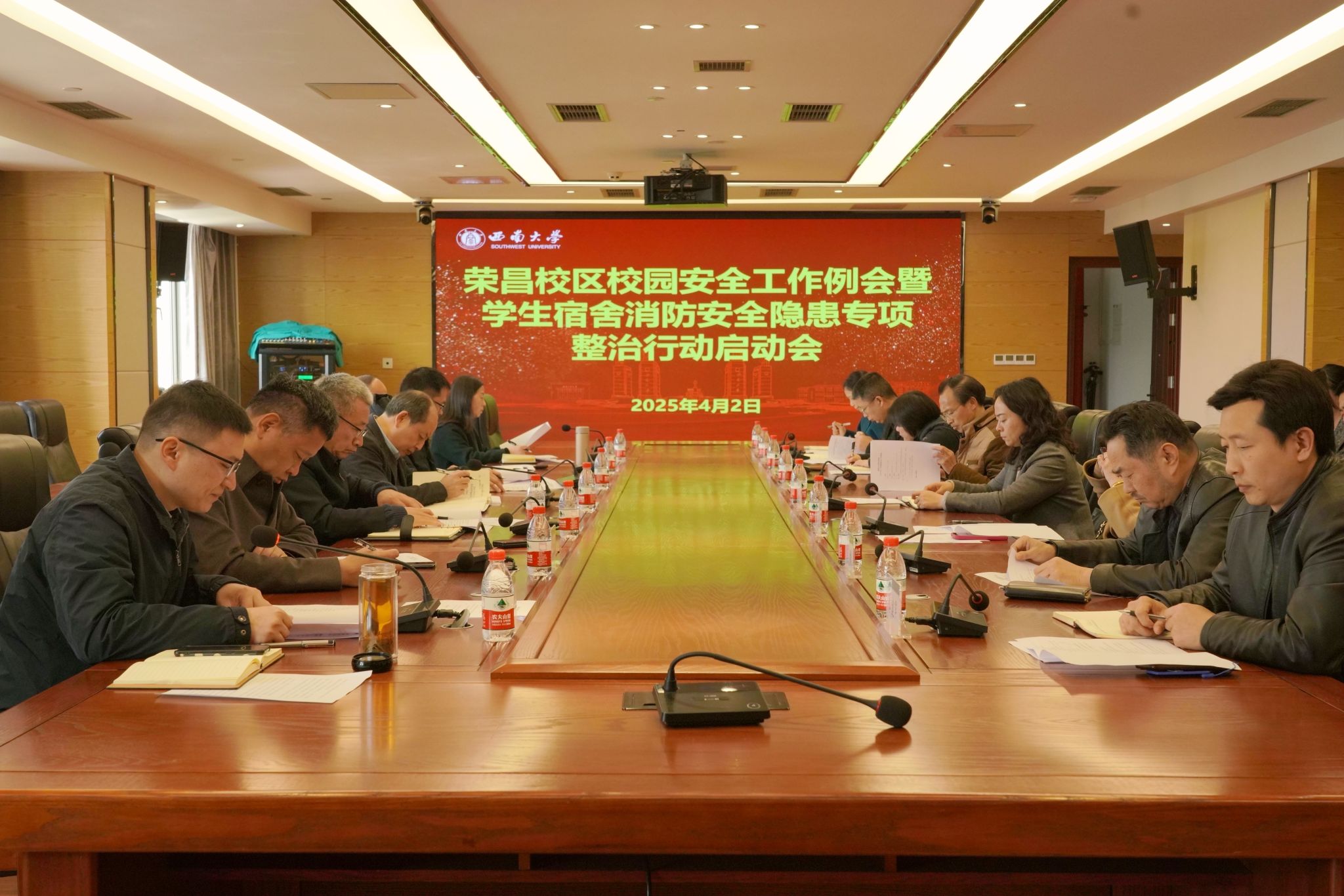 4月2日下午,荣昌校区2025年4月校园安全工作例会暨学生宿舍消防安全隐患整治专项行动启动会在第七教学楼7A804会议室召开,荣昌校区党工委书记、管委会主任周国安,党工委副书记、纪工委书记穆奎,管委会副主任曹烈斌出席会议。在荣学院党委副书记、团委书记,荣昌校区综合办公室、后勤集团荣昌校区服务中心、荣昌校区学生工作办公室、荣昌校区保卫工作办公室负责人和有关工作人员参加会议,穆奎主持会议。