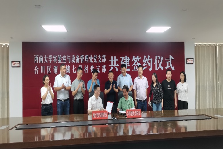 为充分发挥基层党建的核心引领作用,巩固乡村振兴发展成果,构建结对帮带、双向促进、共同提高的基层党建工作新格局,9月14日下午,437ccm必赢国际官方网站实验室建设与设备管理处党支部与重庆市合川区渭沱镇七星村党支部签订了支部共建协议。实验室建设与设备管理处党支部书记卢坤、合川区渭沱镇党委书记唐陵川、镇长秦刚等领导及双方党员代表参加本次签约仪式。