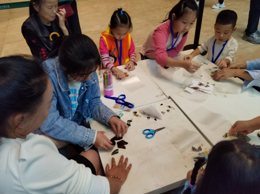 互动区的主角是小朋友们,小朋友们离开父母的帮助,在工作人员的指导下,动手做昆虫书签。小朋友从昆虫材料,植物材料中根据自己想做的书签的样式选出需要的材料,放进两片塑封膜中,然后由工作人员进行后续的塑封。活动一开始便吸引了众多游客前来参加,小朋友们奇思妙想,最后做出来的书签各式各样,充满了童真意趣。活动结束后,小朋友们拿着自己做的昆虫书签与工作人员及家长朋友们一起在展板前合影留念,每一个小朋友的脸上都洋溢着开心的笑容。互动区让小朋友们从小接触昆虫,了解昆虫,是为小朋友们传播昆虫知识的一个重要途径。