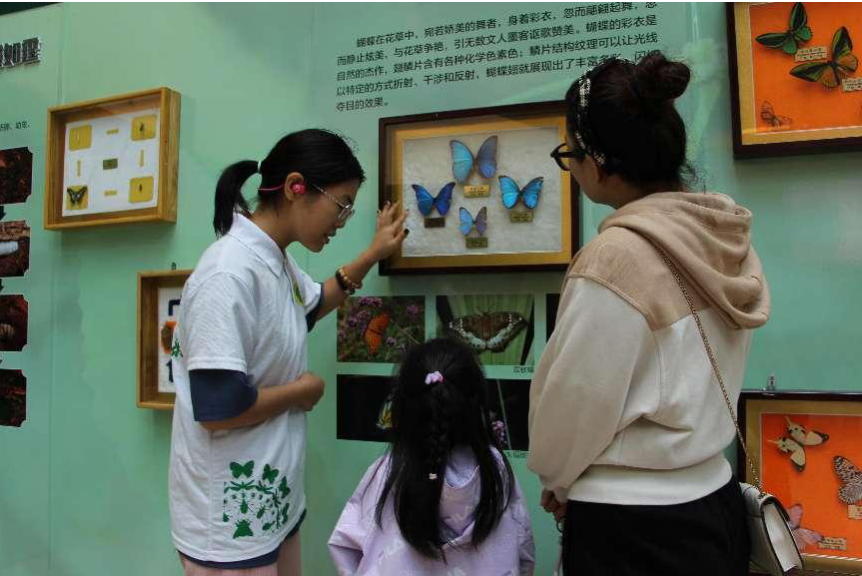 讲解区中设有展板,为大家介绍了昆虫的起源、昆虫的外部形态、昆虫的器官、昆虫的生命历程以及昆虫的防御等与昆虫相关的基本知识。昆虫世界神秘而又充满幻想,在漫长的自然进化过程中,为了种群的生存和繁衍,足智多谋的昆虫们使用不同策略,形成了风格各异,千姿百态的外部形态。在讲解区中,我们选出了昆虫王国中在外形上有着天差地别的两个极端的例子:甲虫和蝴蝶,来诠释讲解区的主题——昆虫世界的刚与柔。甲虫,被评为世界上最坚硬的动物之一,最硬的一种甲虫甚至可以承受自身39000倍的重量,毫无疑问是刚的代名词。“彩羽翩跹舞蓝天,轻盈身姿如花蕊”,而蝴蝶轻盈飘逸,色彩缤纷,则是柔的代名词。为了让大家更好理解,展板上还附带有各种活灵活现的图片和栩栩如生的标本。背着坚硬外壳的甲虫,飞舞的蝴蝶色彩绚丽婀娜多姿,正在破茧的蛹萌发出勃勃生机……。讲解人员给在展板前驻足的大朋友和小朋友们耐心讲解,绘声绘色的专业讲解配上活灵活现的图片让更多的人对昆虫的了解又深入了一个层次 。
