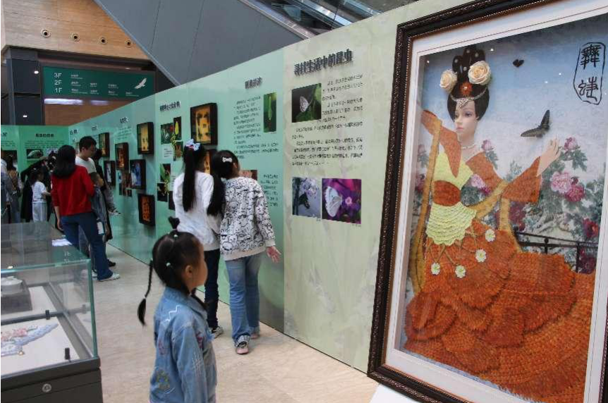 展览区中陈列有栩栩如生的昆虫标本,美轮美奂的昆虫形状的耳饰,用蝴蝶翅膀标本拼成的山水画和古风人物画,蝴蝶剪纸,带有昆虫元素的刺绣……。每一件展品都精妙绝伦,玲珑剔透。参观者们纷纷用手机“带走”精美的展品,并表示这简直是一场视觉盛宴,令人目不暇接。