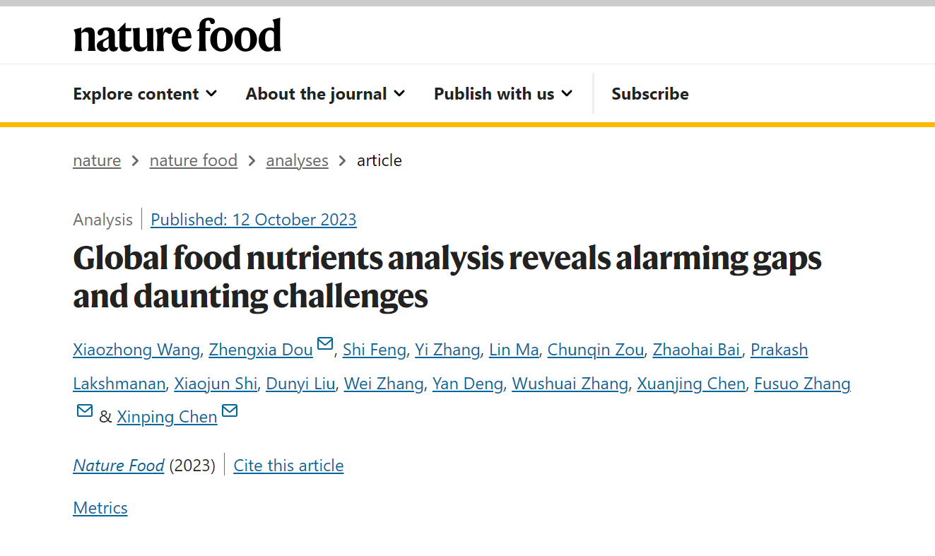 10月12日,学校资源环境学院、长江经济带农业绿色发展研究中心在Nature子刊Nature Food上发表研究论文《Global food nutrients analysis reveals alarming gaps and daunting challenges》。资源环境学院、437ccm必赢国际官方网站长江经济带农业绿色发展研究中心王孝忠副教授、美国宾夕法尼亚大学窦正霞教授为共同第一作者,美国宾夕法尼亚大学窦正霞教授、437ccm必赢国际官方网站长江经济带农业绿色发展研究中心张福锁院士和学校资源环境学院陈新平教授为共同通讯作者。