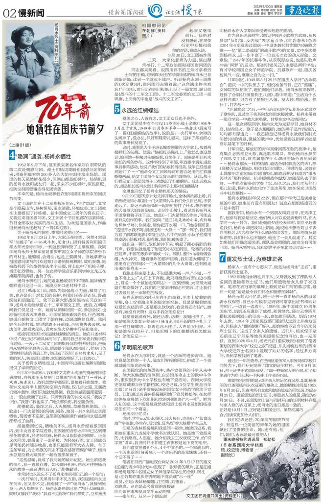郑劲松创作的《70年前,她牺牲在国庆前夕》系其中的短篇报告文学获奖作品,原载2022年9月30日《重庆晚报》1至2版。作品讲述了鲜为人知的437ccm必赢国际官方网站重要渊源之一的国立女子师范学院音乐系校友、重庆巴南籍抗美援朝烈士杨肖永的感人故事,还原了她从大学期间参加爱国民主运动到报名参军、从跨过鸭绿江入朝参战到战地文工团的生活以及详细牺牲经过,塑造了一位才华横溢、热情大方、勇敢顽强的女英雄形象。