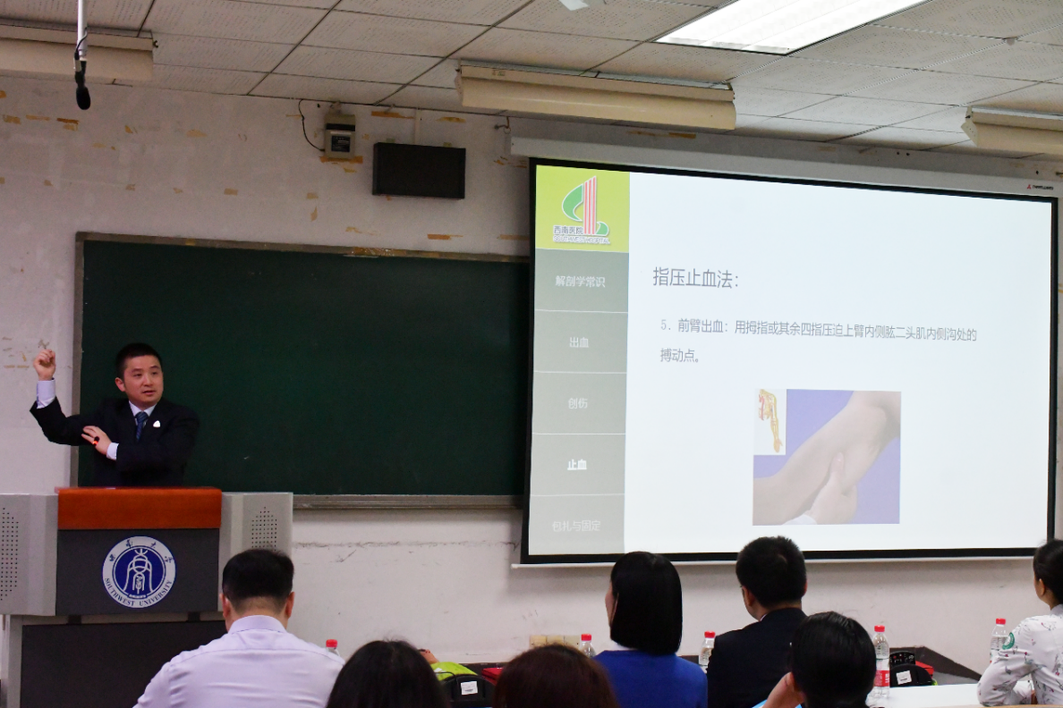 张军医生主要讲解了常见的止血包扎、加压止血、骨折临时固定等急救方法在生活中的应用。张医生与同学们分享了根据出血量判断危机状态的方法以及常见的止血方法。他以身示范,指导同学们学习身体主要动脉位置、判断方法,讲解身体不同部位受伤时的包扎方法和紧急处理方法,培养同学们的紧急处理能力。