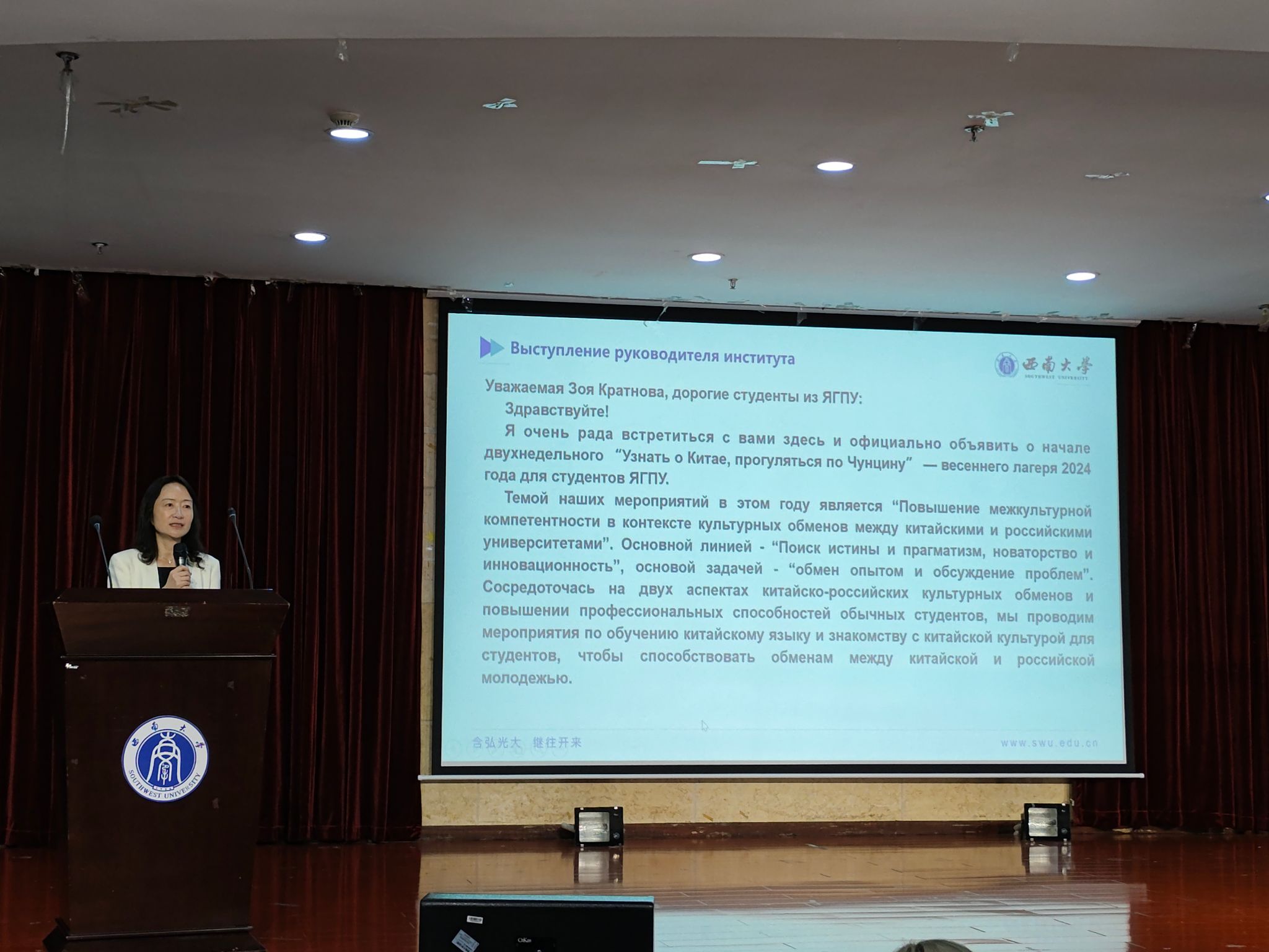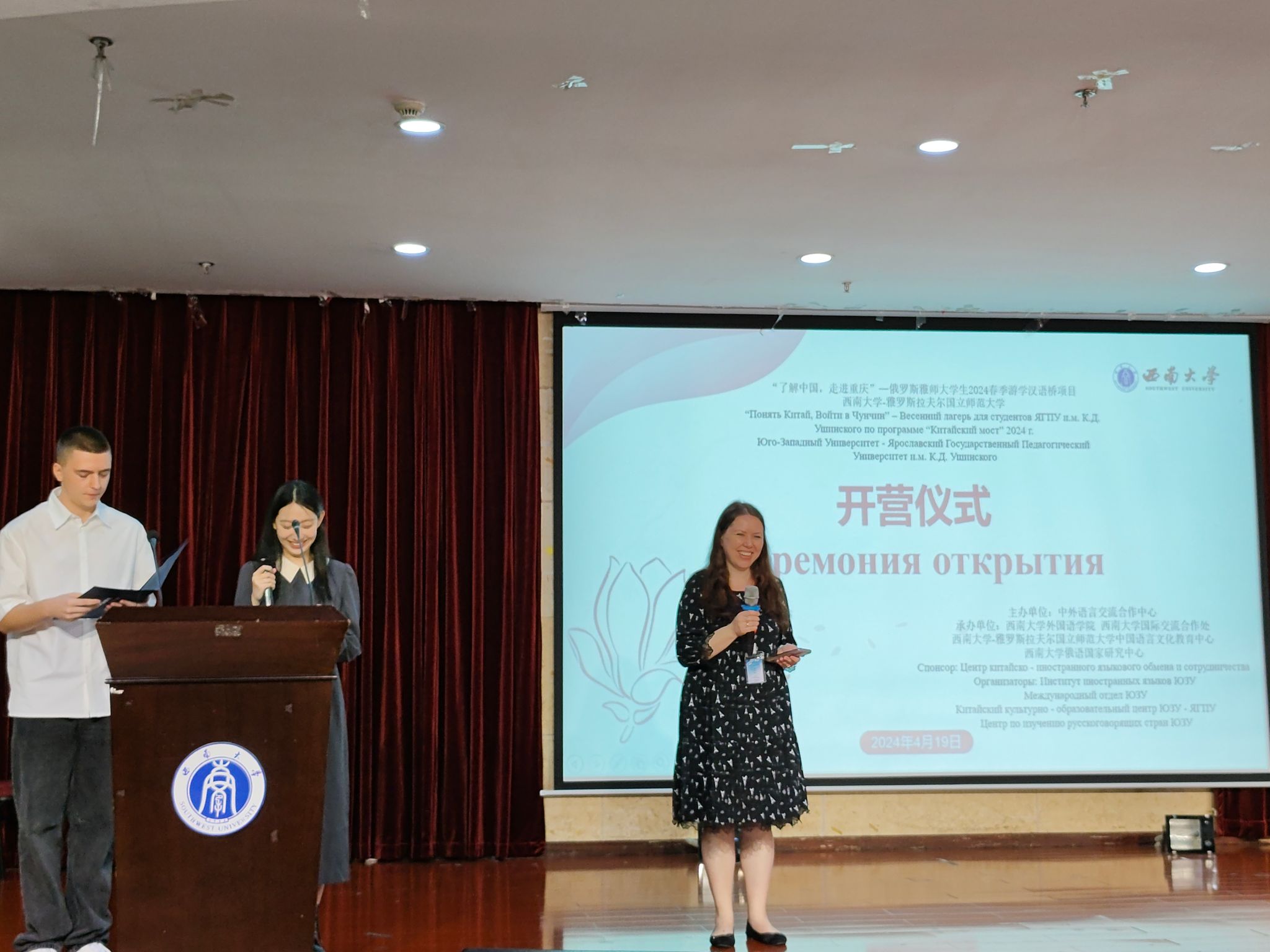4月19日上午9时,由教育部中外语言交流合作中心主办,俄罗斯雅罗斯拉夫尔国立师范大学(以下简称“雅师大”)大学生参加的“了解中国、走进重庆”2024年“汉语桥”项目外国学生春令营活动在437ccm必赢国际官方网站外国语学院101报告厅拉开序幕。437ccm必赢国际官方网站国际合作与交流处代远鸿副处长,外国语学院党委书记徐天虹、副书记纪委书记李晓畅、俄语系主任谢周教授、俄语系外教叶莲娜·鲍尔德列娃教授、奥尔加·卡兹敏娜副教授以及俄方带队老师卓雅·克拉特诺娃、全体营员等出席了本次开营仪式。