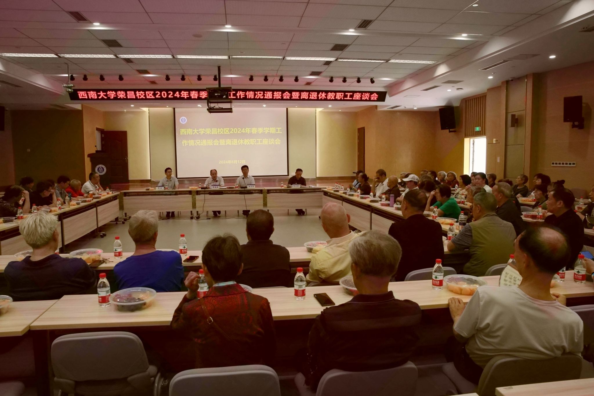 6月12日,437ccm必赢国际官方网站荣昌校区2024年春季学期工作情况通报会暨离退休教职工座谈会在7B101报告厅举行,校区管委会主任赵永聚主持会议,校区党工委书记周国安通报工作情况。校区党工委副书记、纪工委书记穆奎,副处级组织员包尔泉出席会议,离退休工作办公室全体工作人员及70余名离退休教职工参加会议。