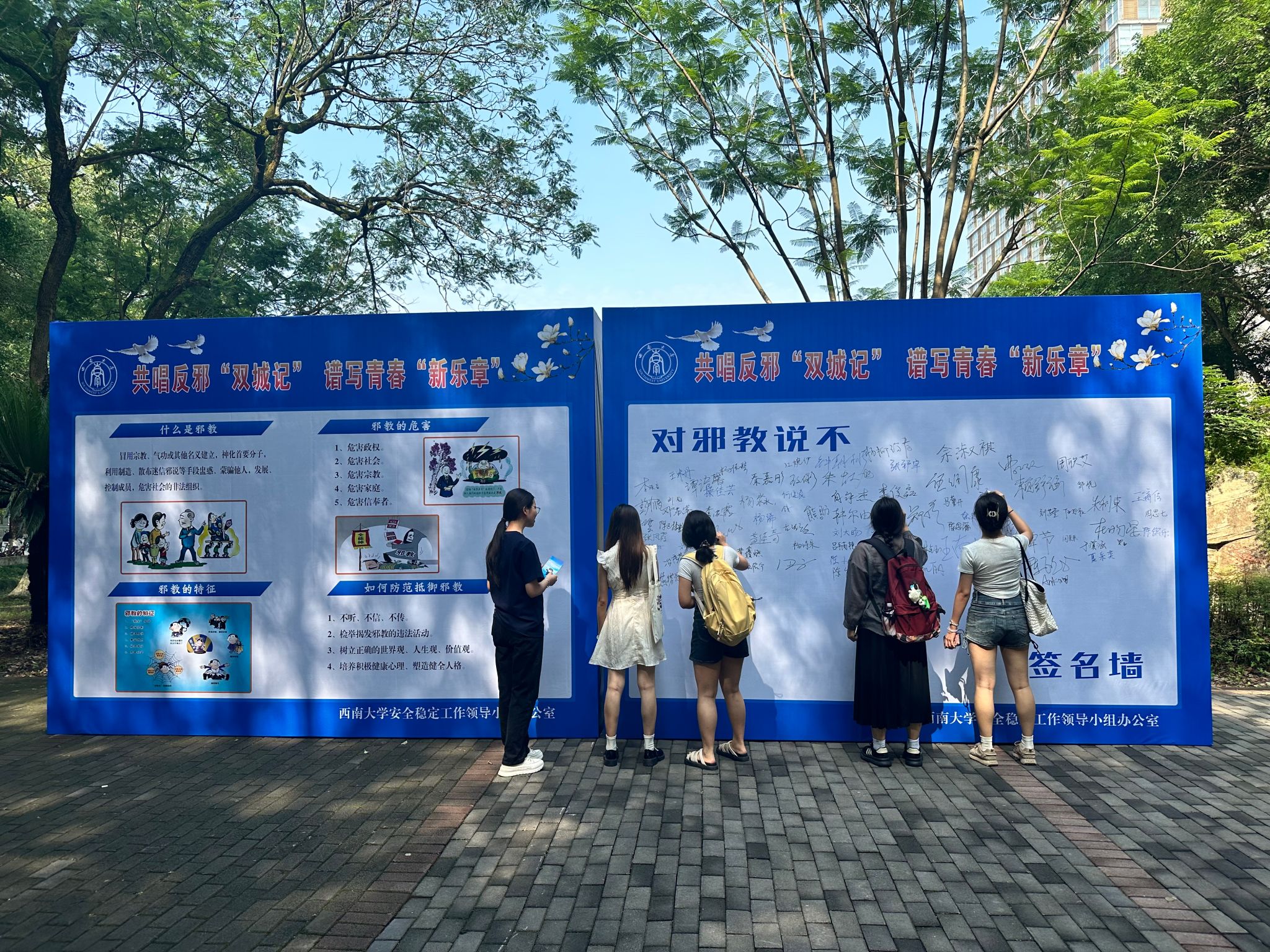 为持续提升师生识别防范和抵御反制邪教侵蚀的意识和能力,筑牢学校反邪教防线,构建和谐平安文明校园。学校近期开展了以“共唱反邪双城记 谱写青春新乐章”为主题的反邪教警示宣传教育系列活动。