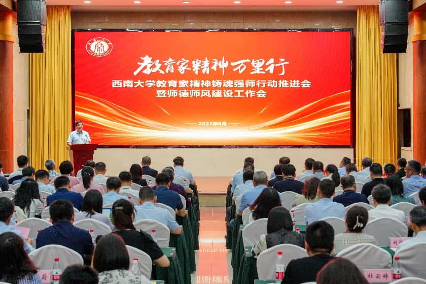 为深入贯彻习近平总书记关于教育的重要论述及全国教育大会精神,积极响应《教育部办公厅关于开展 “教育家精神万里行”活动的通知》,5月19日,学校在东方红会议厅举行教育家精神铸魂强师行动推进会暨师德师风建设工作会。党委书记张卫国、校长王进军以及相关校领导出席,学校教师工作委员会成员单位负责人、各二级党组织负责人以及师生代表参会。副校长邹芙都主持会议。